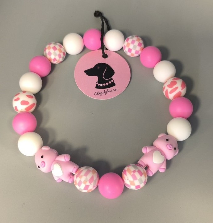 A rózsaszín és fehér gyöngyök kombinációja tökéletesen passzol a mintás elemekhez, a kis malackák pedig konkrétan ellopják a show-t.