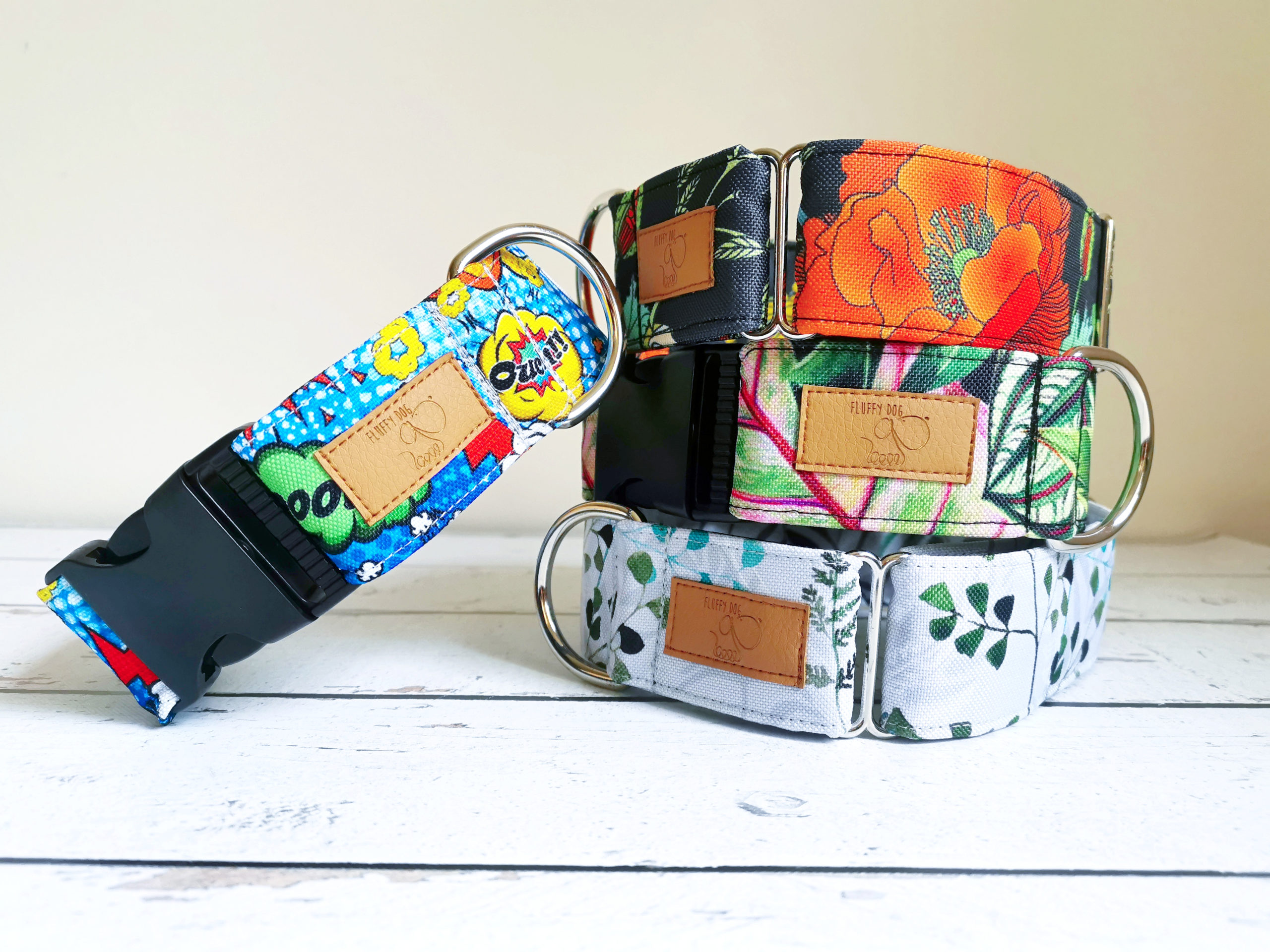 A FluffyDog Design vízlepergető nyakörv alapja erős poliészter heveder, amit vízlepergető, mintás anyag borít.