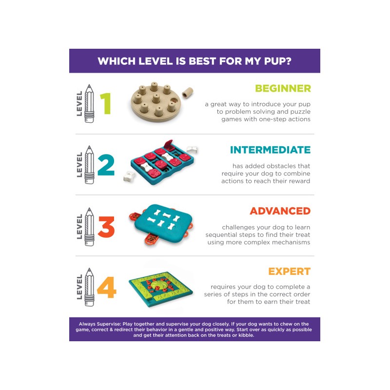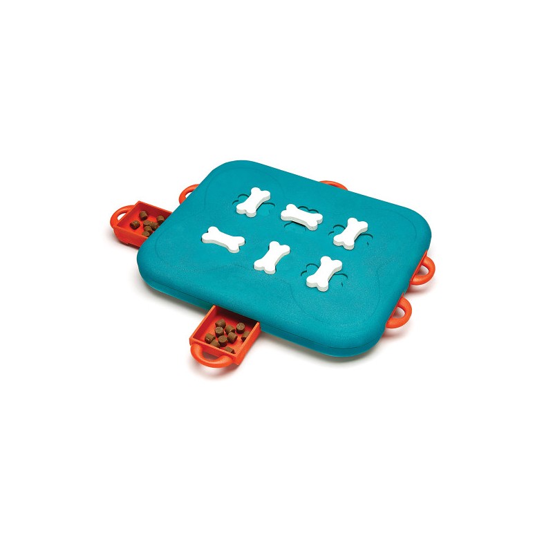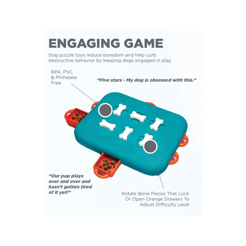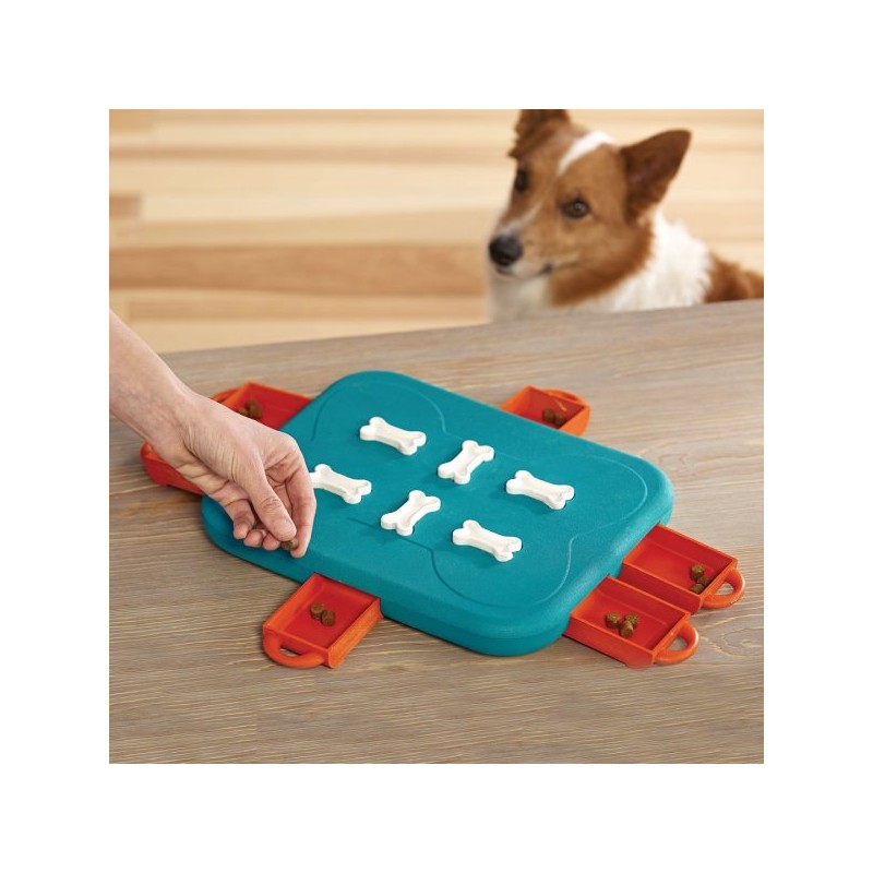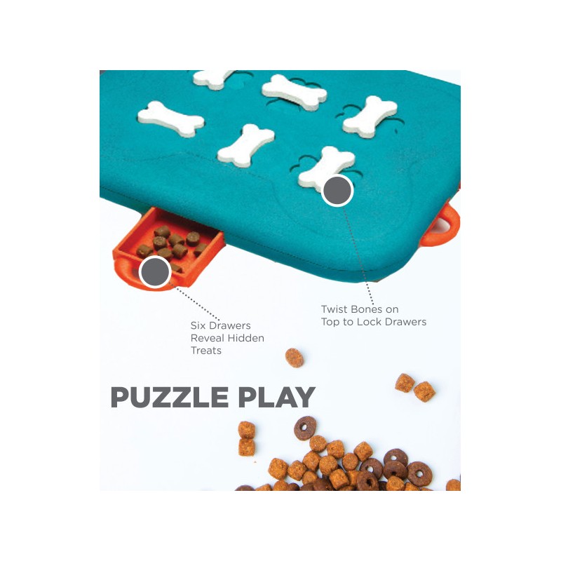 A játék 6 kihúzható csemegefiókkal rendelkezik, amelyekbe jutalomfalatot rejthetsz. A kihívás ott kezdődik, hogy a fiókokat forgatható csont alakú zárakkal lehet lezárni. A kutyának először rá kell jönnie a sorrendre: csavarni, húzni, tolni – és csak ezután jöhet a jutalom.