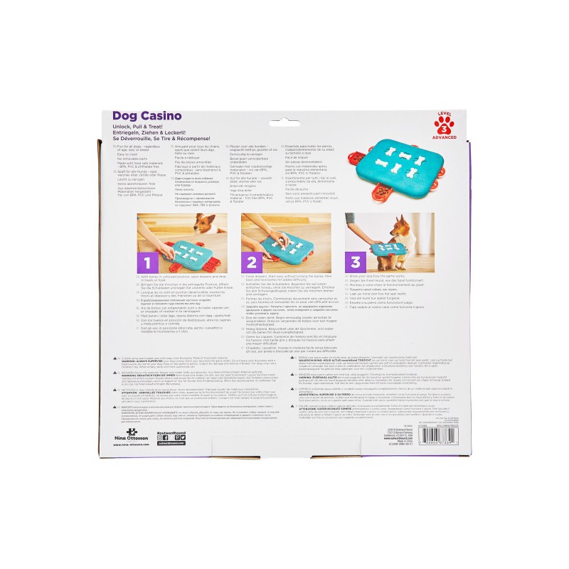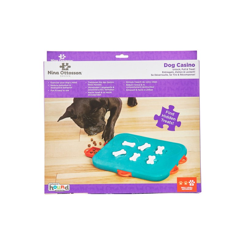 Az Outward Hound Dog Casino egy 3. szintű, haladó interaktív csemege kirakós kutyajáték, amelyet Nina Ottosson tervezett azoknak a kutyáknak, akik már túl vannak az alap logikai feladatokon. Ideális választás unatkozó, túl aktív vagy rombolásra hajlamos kutyák számára, akiknek nem elég a sima séta vagy rágóka.