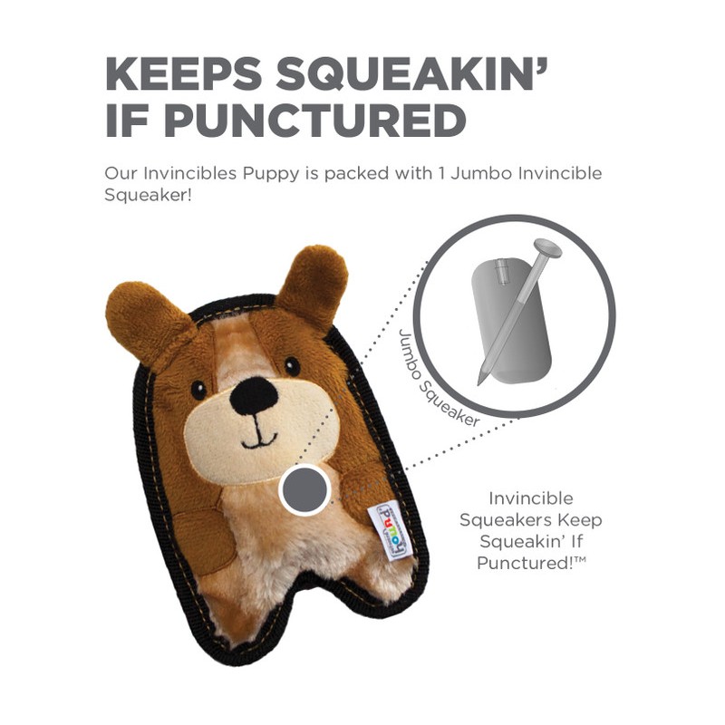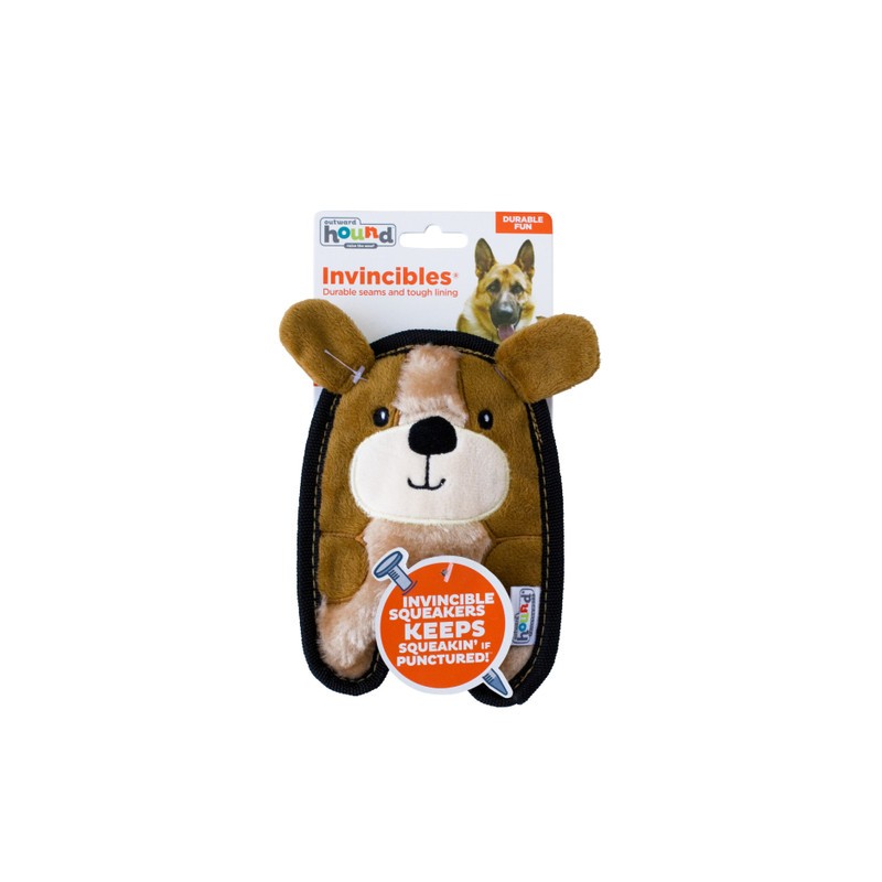 Az Outward Hound Invincibles Mini plüss kutyus töltelékmentes, Dura-Tuff belső béléssel és dupla varrással készült, így a játék hosszabb ideig marad egyben, még heves használat mellett is. A különleges squeaker mechanizmusnak köszönhetően a játék akkor is sípol, ha megsérül. A játék kisméretű, könnyű, így a kutya számára kényelmesen cipelhető és rázogatható.
