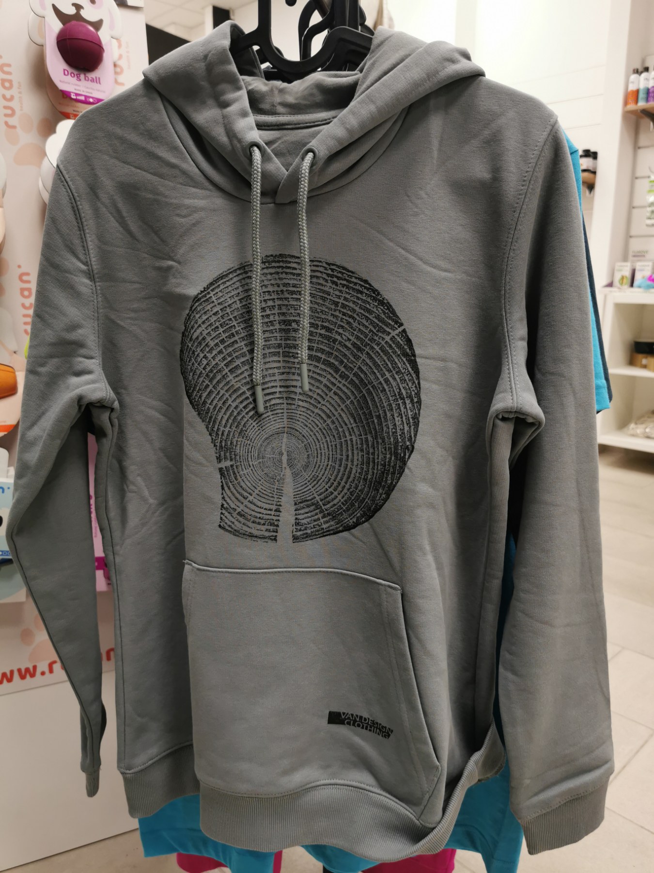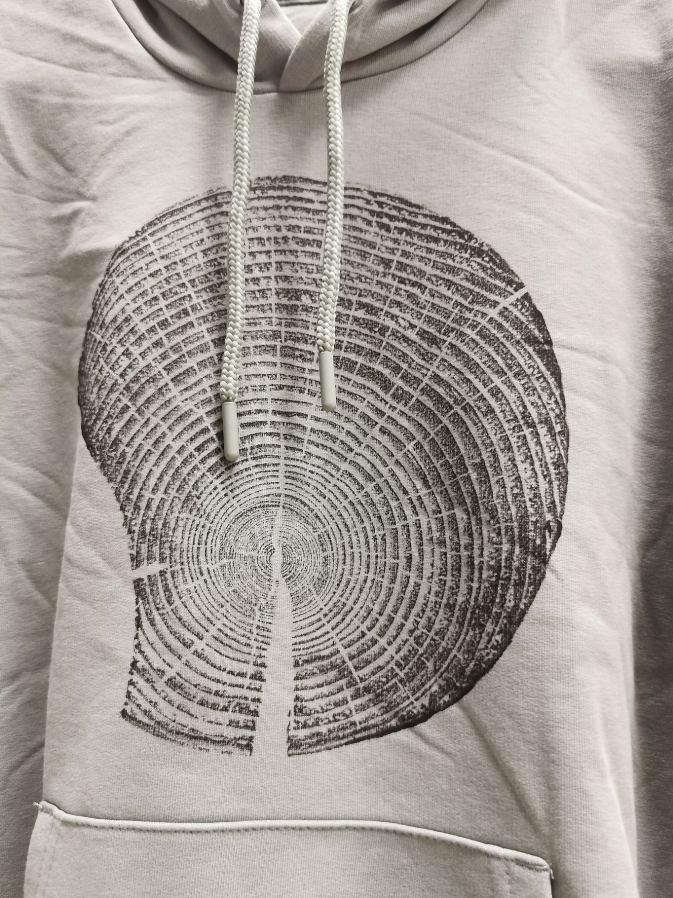 A VanDesign HOLD biopamut kapucnis pulóver valódi faévgyűrű-lenyomattal készült, egy szibériai borovi fenyő rönkjének különleges mintázatával. Finom, igényes, organikus és teljesen egyedi.